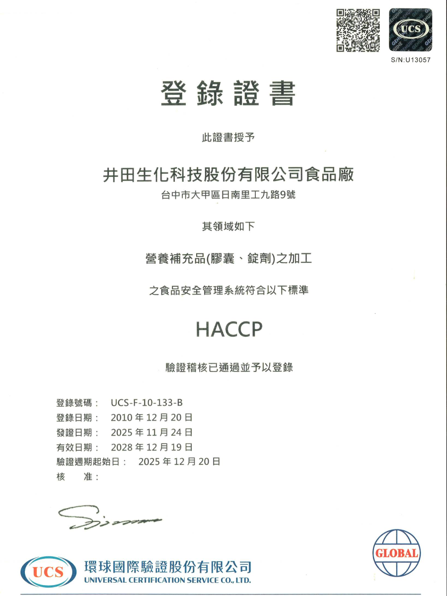 取得營養補充品(膠囊、顆粒劑、錠劑)之加工「HACCP證書」