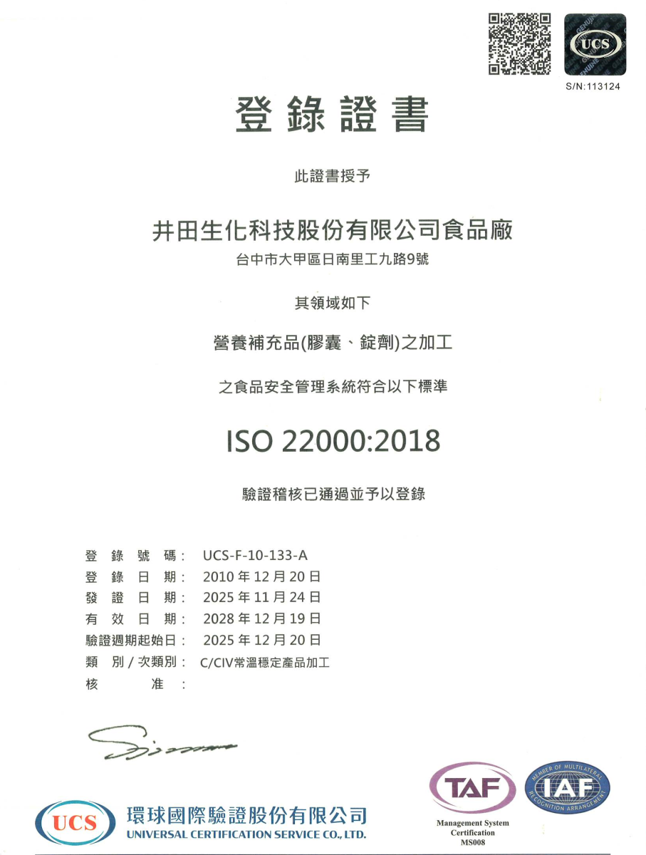 ISO22000:2018登錄證書
